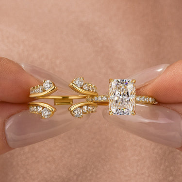 Anello di matrimonio in oro giallo con moissanite da 3,5 carati a taglio radiant con anello di enhancer