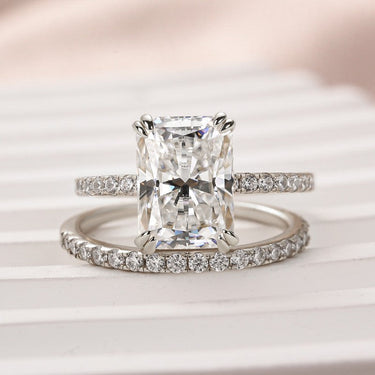 Il Moissanite 4,5 Ct Taglio Radiant Anello Nuziale in Oro Bianco da Donna è una straordinaria celebrazione dell'amore, pensato per chi apprezza le linee pulite e il fuoco brillante. Presentando una moissanite taglio radiant da 4,5 carati, questo anello offre un mix unico di spigoli netti e bagliore delicato, unendo la brillantezza del taglio rotondo alla sofisticatezza della forma smeraldo.