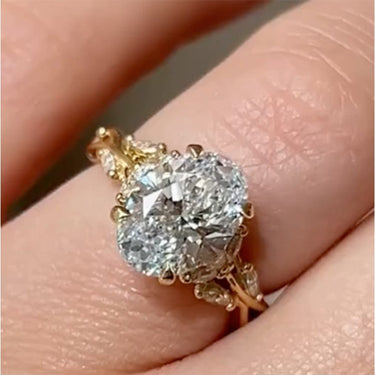 Questo anello di fidanzamento vintage con Moissanite taglio ovale da 3.0 carati presenta brillanti pietre laterali, incastonate lungo una fascia in argento sterling elegantemente intrecciata. La pietra centrale ovale brilla intensamente, mentre il design intrecciato dona un tocco moderno ed elegante allo stile ispirato al vintage.